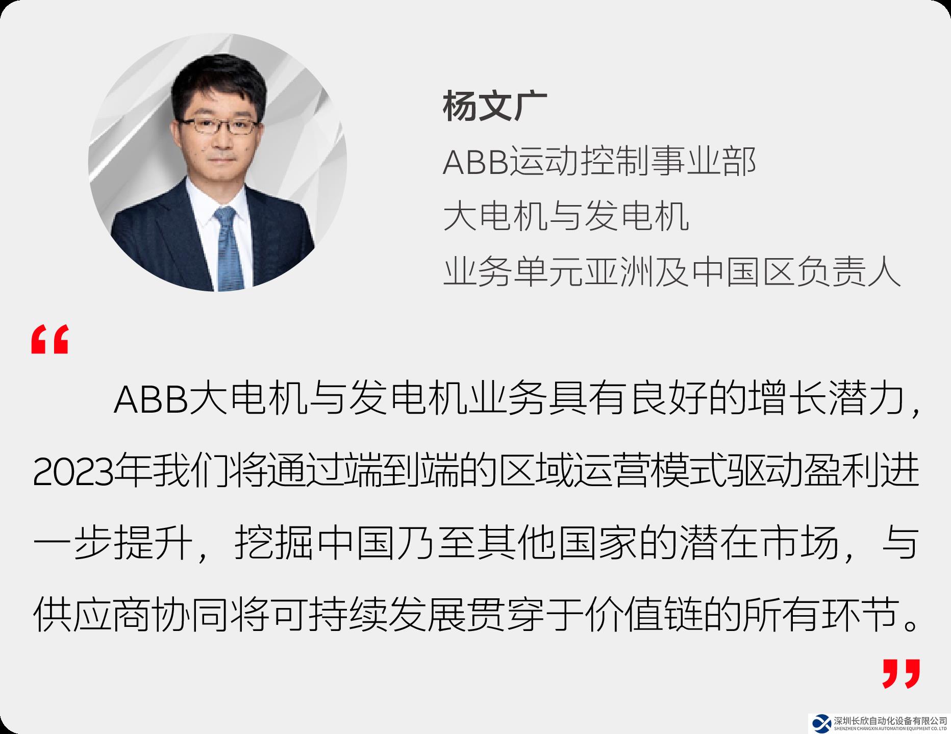 会上,ABB运动控制事业部大电机与发电机业务单元亚洲及中国区负责人杨文广对供应商合作伙伴的到来表示热烈欢迎,感谢大家携手精耕,砥砺前行并就ABB大电机及发电机2022年业绩完成情况、2025年公司的战略、目标任务、共建高质量的价值链等方面做详细介绍。
