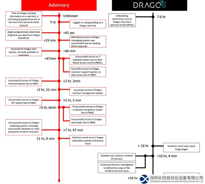 在攻击者访问员工帐户的16小时内,由于基于角色的访问控制(RBAC)规则,攻击者尝试访问了多个Dragos系统,包括消息传递、IT帮助台、财务、提案请求(RFP)、员工识别和营销系统,但都以失败告终。
