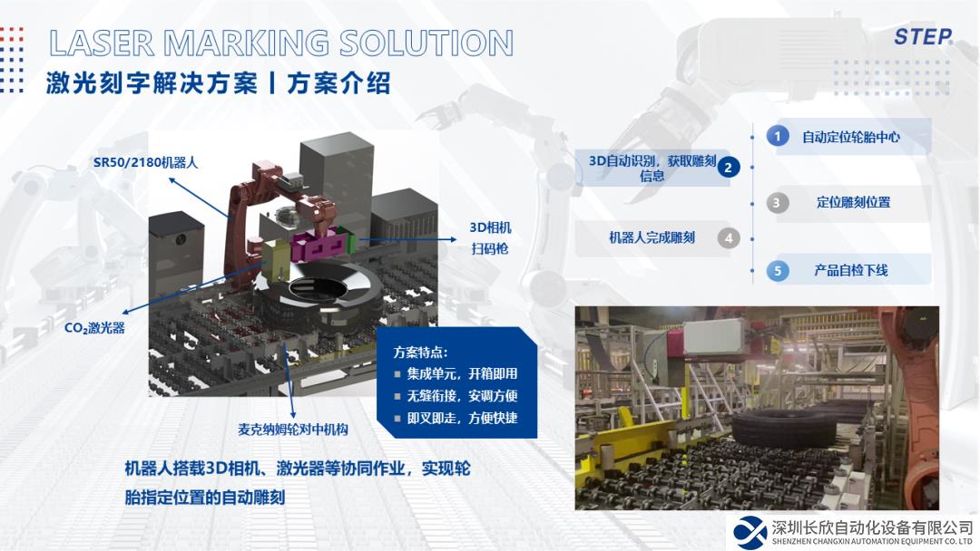 该方案颠覆传统生产工艺,由新时达六轴机器人、3D激光视觉系统、激光雕刻系统、麦克纳姆轮对中机构等组成工作站,采用全新工艺,取代了传统生产中预埋周期牌、钢小票和硫化镂空条码的生产工艺,能实现轮胎指定位置的自动雕刻,具有生产节拍快,同时刻字清晰美观、平整光滑,无胶边的特点,提高了硫化机的使用率和产品的品相等级。