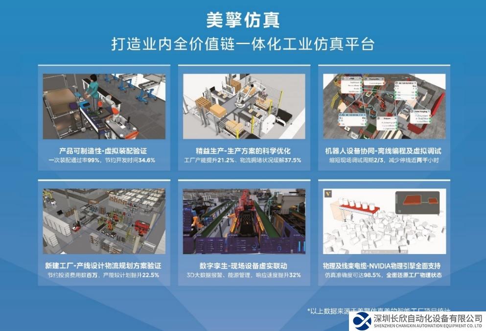 展会现场,美的还重点展示了业内全价值链一体化工业仿真平台——美擎仿真,集3D 工艺仿真、装配仿真、人机协作、物流仿真、机器人仿真、虚拟调试、数字孪生工厂等功能于一体,可以对工厂的生产线布局、设备配置、生产制造工艺路径、物流等进行预规划,并在仿真模型“预演”的基础之上,进行分析、评估、验证,迅速发现系统运行中存在的问题和提升点,并及时进行调整与优化,减少现场实施或实际生产时变更或返工,从而有效减低成本、缩短工期、提高效率。美擎仿真坚持本土研发,更契合国内本土需求,着力于为制造企业、系统整合商、自动化设备公司等提供数字化智能工厂解决方案。
