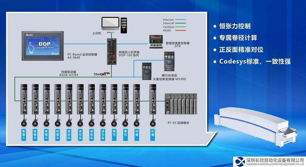 台达解决方案从工艺难点出发,专属的控制模块能够解决工序中的张力控制、纠偏控制、温度控制、涂布头控制等工艺难题,确保设备运转的同步精度和提高运行速度等。