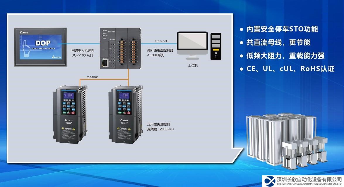 台达方案应用高性能矢量控制变频器CP2000 Plus系列,超重载型过载能力强,防滤波、防噪声干扰能力强;产品符合多种国际标准和欧盟标准,能够满足设备厂商出海要求;多样化通讯模式支持各种设备生产需要。