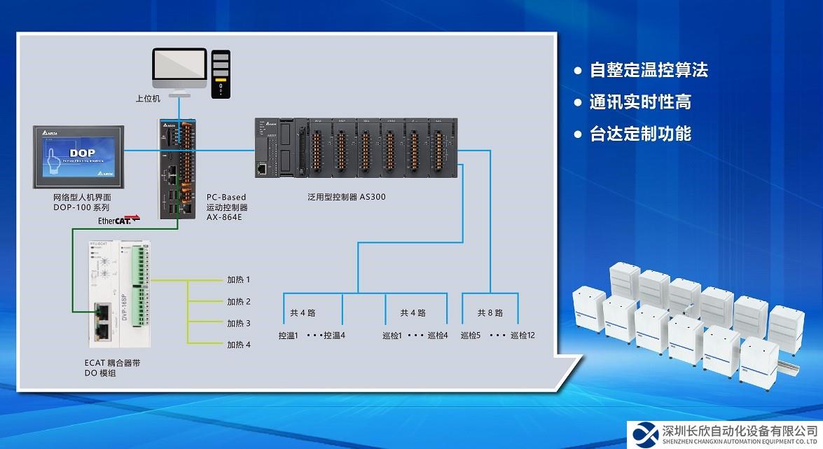 台达解决方案采用带自整定功能的专用温度PID功能块,通过PC-Based高阶运动控制器AX-8系列的高效运算能力,达到控温要求;同时控制器的模块化程序设计,也显著缩短了开发时间。