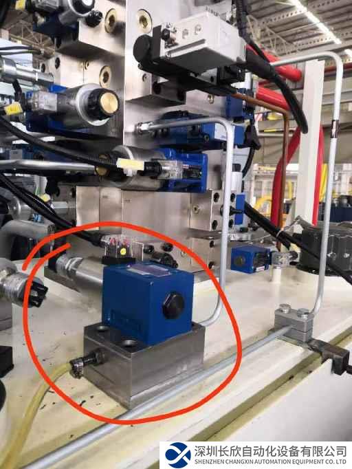 安装2个过压检测阀,并设定其阈值作为液压系统的最终保护参数。一旦触发,则与急停效果一样,利用液压系统的自锁功能和额外的锁定装置,防止滑块下滑。