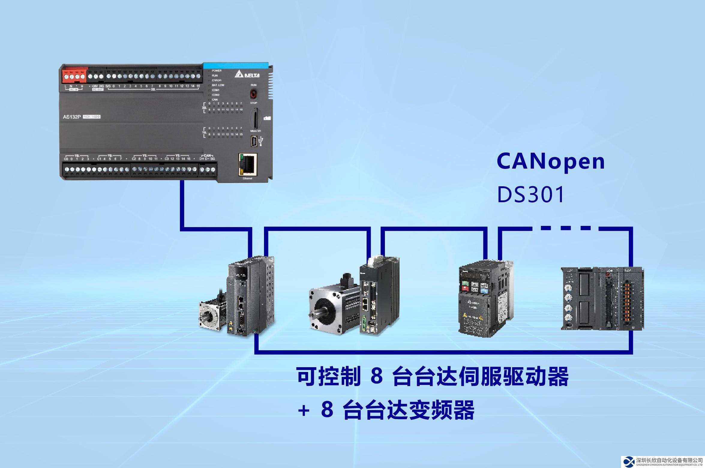 通过台达专属CANopen 控制功能,可控制8台伺服驱动器与8台台达变频器,仅需简单指令即可完成快速定位。
