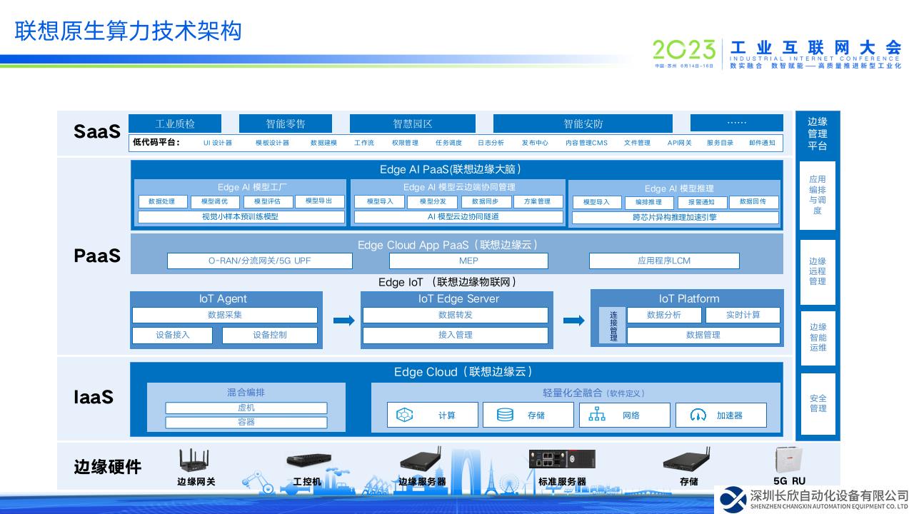 作为产业发展的风向标,2023工业互联网大会于6月14—16日在江苏省苏州市举办。在中国信息通信研究院、中国通信学会边缘计算委员会承办的“边缘原生 开放无界”工业互联网边缘计算论坛上,历时三年打造的国内首个边缘计算产品名录正式发布,同时大会公布了第四批边缘计算标准件计划评测结果,联想慧天智能边缘产品家族两款产品——联想慧天工控机IPC-A60和智能网关联想ThinkEdge SE30顺利过测。在会上,联想ISG中国战略部总经理、联想智能边缘中国事业部总经理杨春带来了《联想慧天——边缘原生算力助力千行百业智能化转型》主题分享。自发布联想慧天智能边缘产品家族以来,联想正致力于成为业界领先的边缘计算解决方案提供商,以边缘原生算力赋能企业智能化转型。