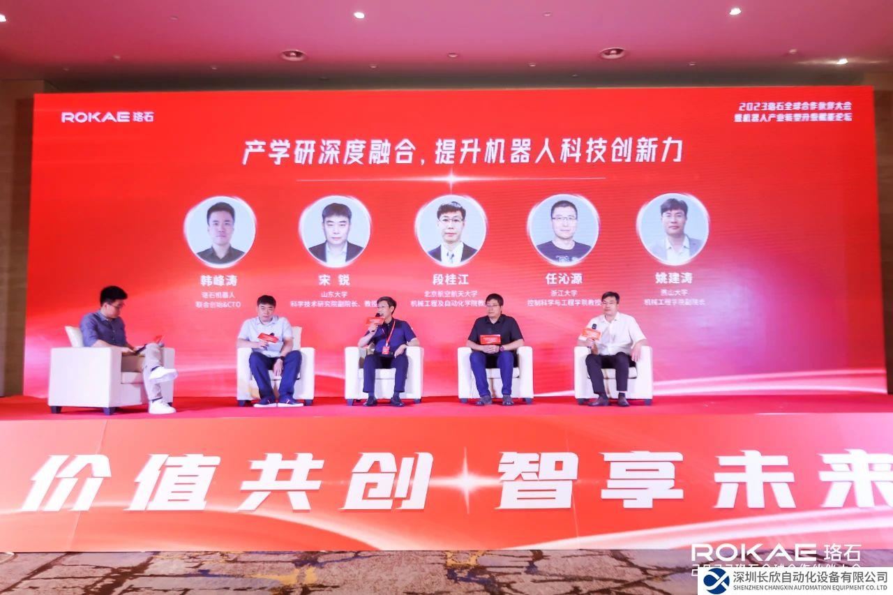 珞石机人联合创始人&CTO韩峰涛携山东大学科学技术研究院副院长宋锐教授,北京航空航天大学机械工程及自动化学院段桂江教授,浙江大学控制科学与工程学院任沁源教授,燕山大学机械工程学院副院长姚建涛教授围绕“产学研深度融合,提升机器人科技创新力”主题展开了圆桌讨论,专家们各抒己见,就机器人+大模型的落地与未来、产学研融合创新的经验教训等话题发表了个人观点与看法。
