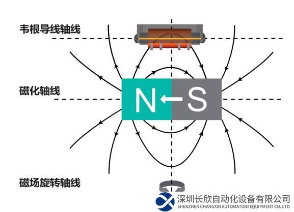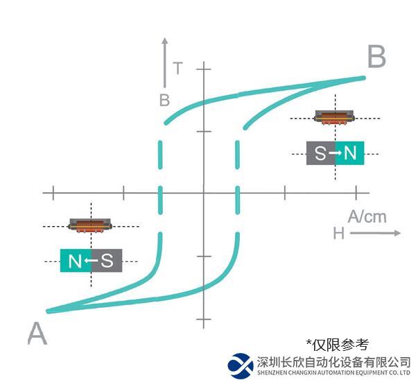 为了理想的激活韦根效应,韦根导线必须暴露在相反磁极的交替“饱和”状态下。这些“饱和”状态可以在A点和b点的滞回图 上看到。陡峭的虚线表示韦根线的磁性反向,韦根传感器产生脉 冲的点。虽然这些反转发生在比饱和状态更低的通量密度下,但 为了获得最佳脉冲性能,韦根导线应该在“返回”(到a)之前达到 相反的饱和状态(B)。