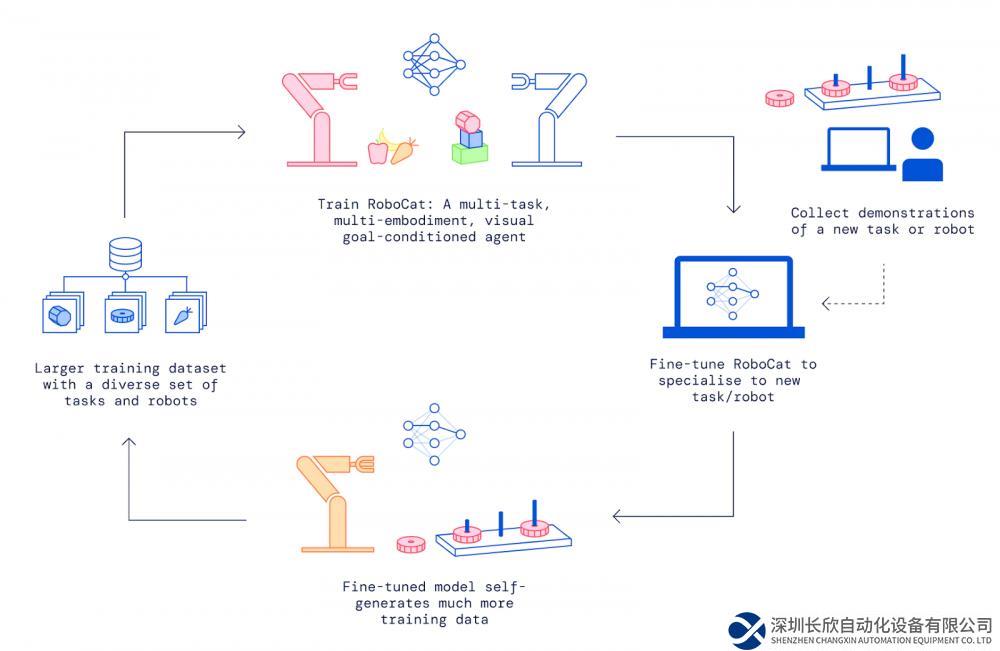DeepMind称,RoboCat是全球第一个可以解决和适应多种任务的机器人AI智能体,并且它可以在各类真实的机器人产品上完成这些任务,“RoboCat的快速学习能力减少了对人类监督训练的需求,是朝着创建通用机器人迈出的重要一步。”