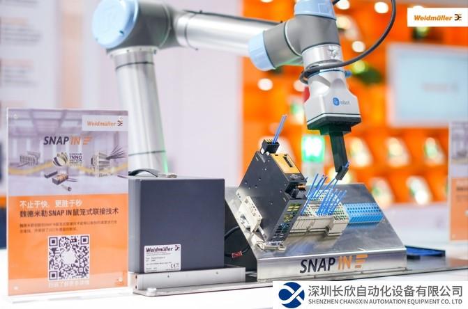 本次展会,魏德米勒带来了创新SNAP IN鼠笼式联接技术,它综合了常见的弹片式和直插式技术的优点,巧妙地设计了一个老鼠夹子式的联接方式,接线过程无需任何工具。在接线完成时会有“咔哒“一声和听觉反馈,退线时也无需工具,只需按下按钮,联接点即可重新打开。与“弹片式”或“螺钉式”连接器相比,SNAP IN鼠笼式联接的效率能提高至少60%。现场演示的SNAP IN机械手臂接线应用,通过UR机器手臂操作剥线,插线的全流程,带观众近距离领略SNAP IN联接技术。