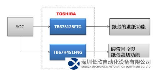 在本方案中,TB67S128FTG负责纸张的进纸控制,TB67H451FNG用于碳带回收与纸张裁切控制,通过这两个电机驱动IC,可实现高效、易用的工业型条码打印机开发。