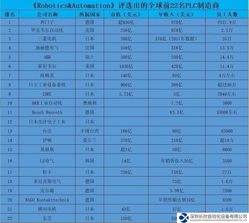 在2020年外媒《Robotics&Automation》评选出的前22名可编程逻辑控制器制造商榜单中,西门子、霍尼韦尔、施耐德、ABB、三菱电机等众多工控巨头企业赫然在列,仍然是欧美日占主导地位,其中日本公司有9家,德国公司5家,美国公司2家,中国1家。