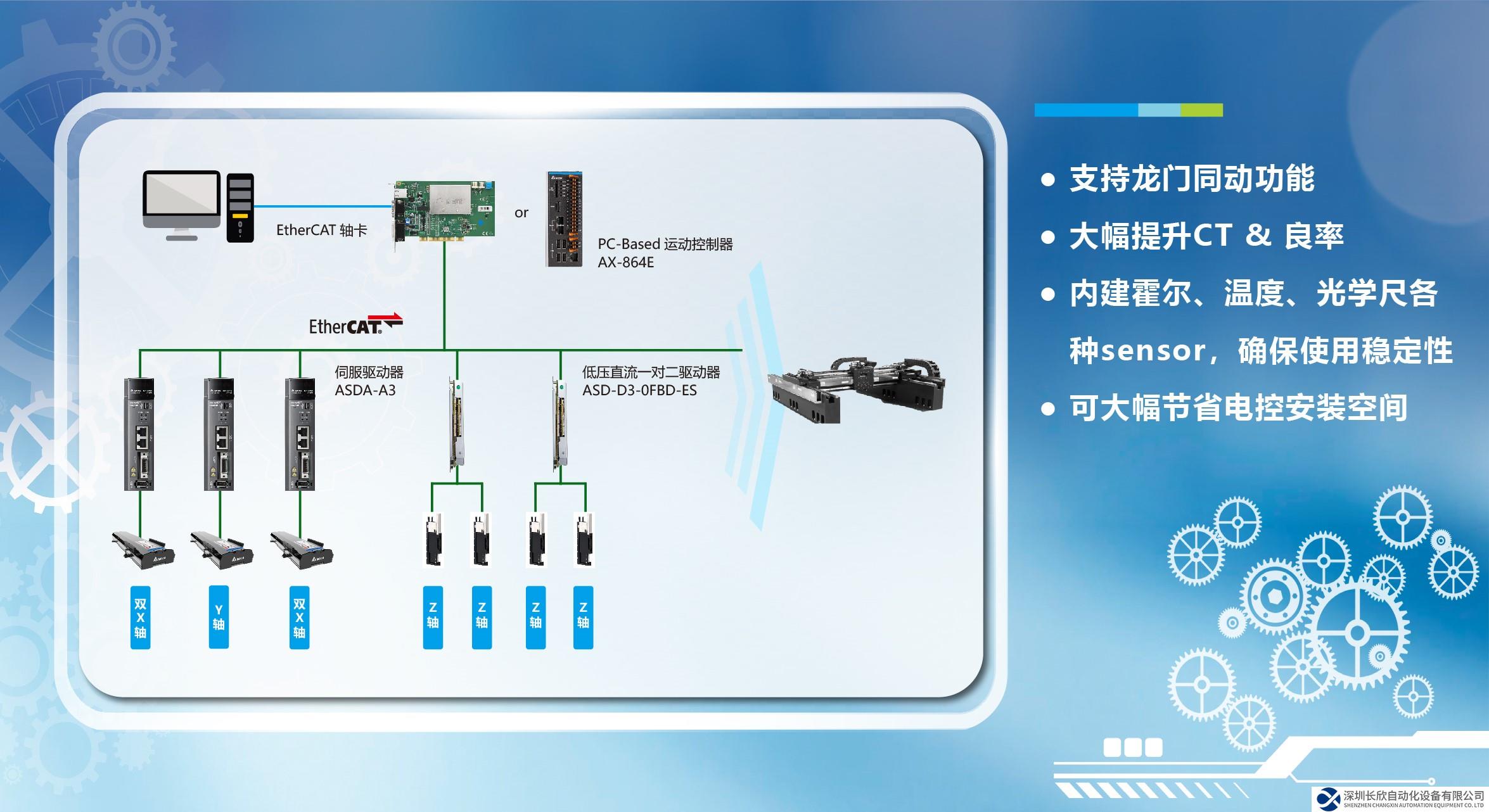 内建力量控制并兼具高速高精运动性能,满足高精度及高响应需求;龙门同动功能可达成双直线电机共同驱动单一轴向运动提升CT及良率。