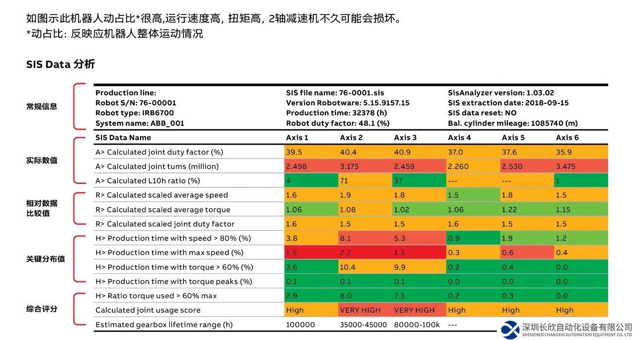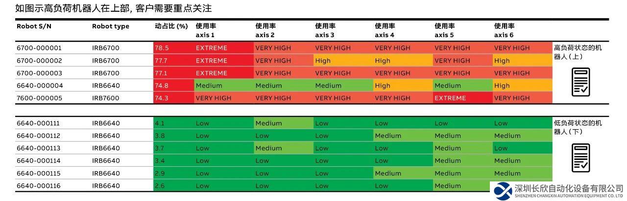 同一条生产线上,不同机器人各轴的运动节拍和动态特性可能都不尽相同。因此,少数工作强度过大的机器人便成为了产线上的“瓶颈”机器人,一旦出现故障便会影响整条产线。为了消除客户在自动化之旅的这份担忧,ABB推出全新服务产品——基于状态的维护报告(CBM),协助客户制定精准的预防性维护计划,防止意外停机,延长机器人使用寿命。