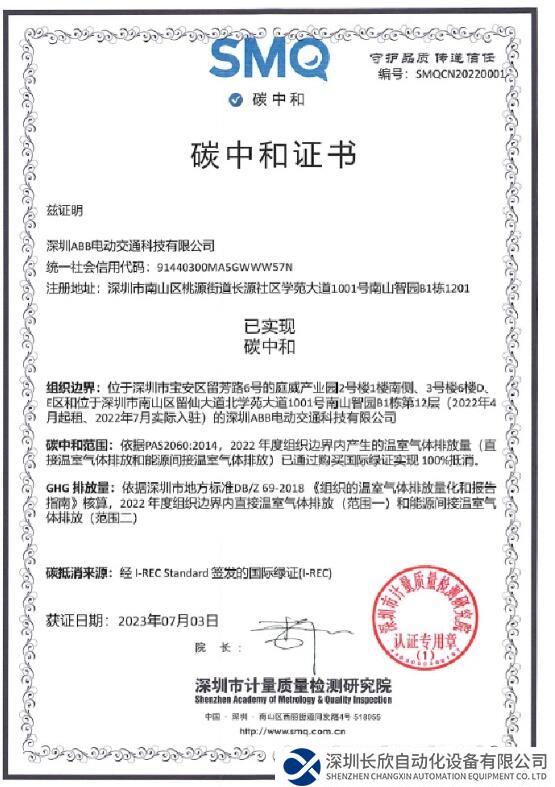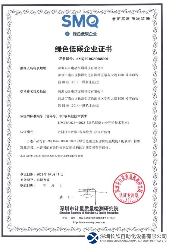 近日,深圳ABB电动交通科技有限公司喜获由深圳市计量质量检测研究院评定的《碳中和证书》及《绿色低碳企业证书》,充分彰显其以自身行动积极应对气候变化,履行企业社会责任,赋能实现零排放未来的使命担当。