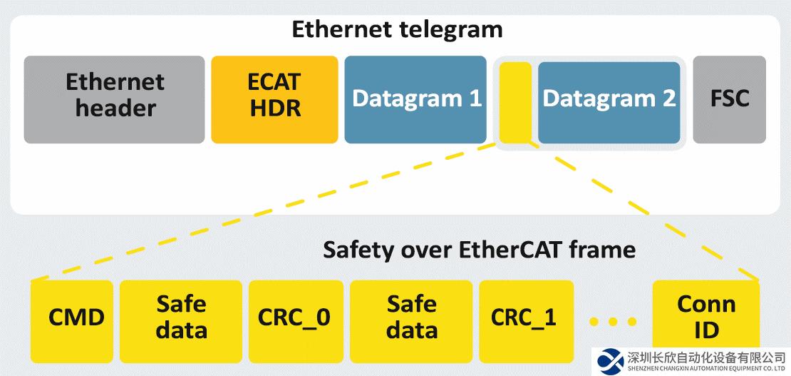 安全数据作为容器嵌入到标准过程数据中,并结合了其他额外数据来保证其完整性。在每个安全周期中,FSoE主站和FSoE从站之间的安全连接被全面监视。每个FSoE帧传输的安全帧校验、连接ID和看门狗时间都将被检查。