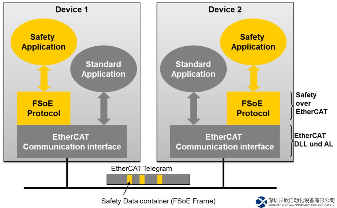 FSoE的软件架构如下图所示。FSoE协议是在EtherCAT通讯接口上的应用层通讯协议,其基础仍然是标准EtherCAT。“安全容器” 可通过现场总线系统、以太网,或其它类似技术传输,而物理介质可以是铜缆、光纤,甚至是无线。